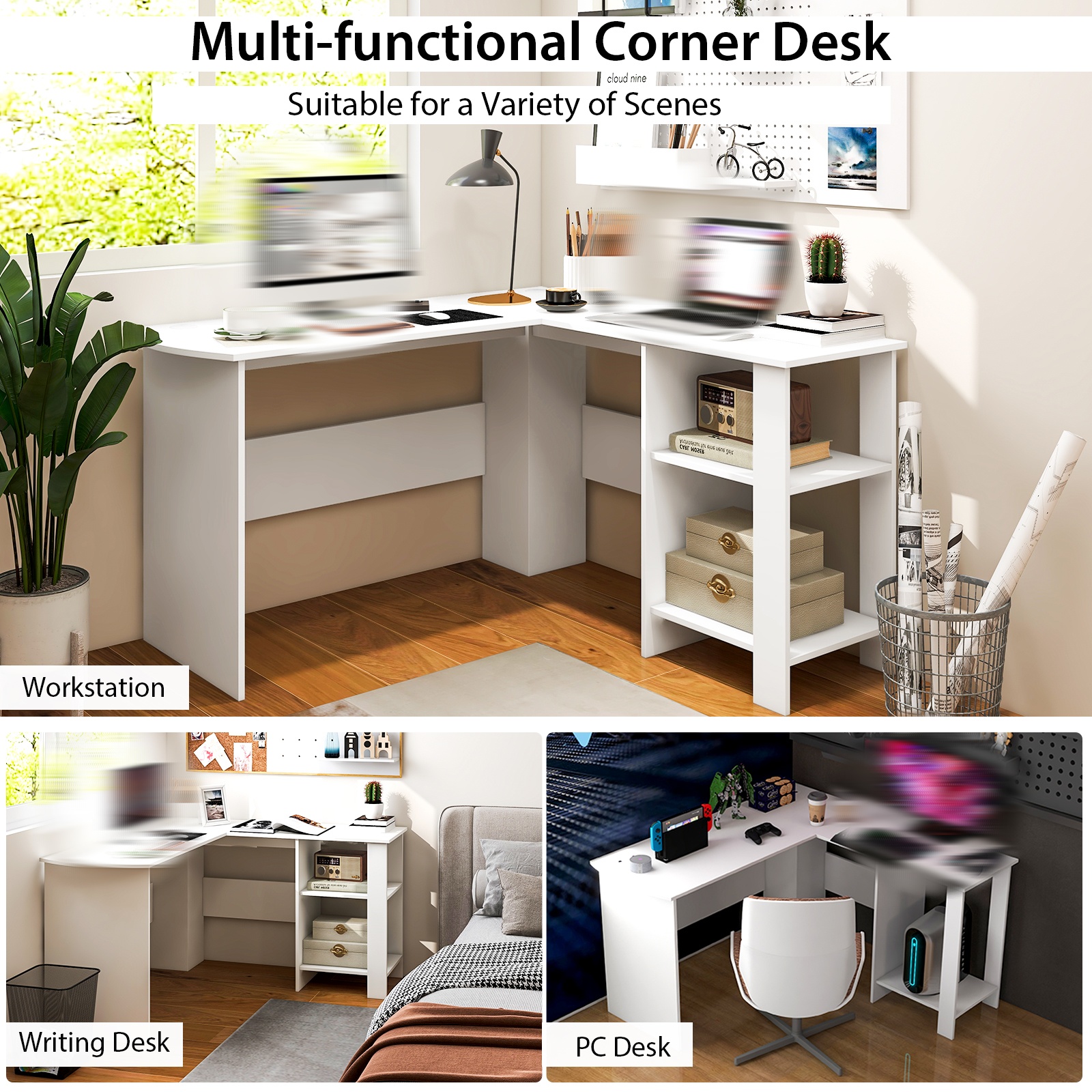 COSTWAY L-shaped Corner Computer Desk Home Office Writing Workstation w\u002F Storage Shelves
